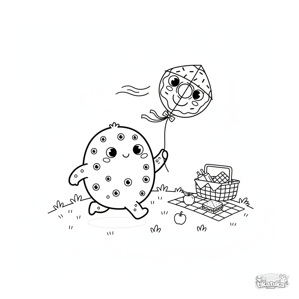 Ausmalbild für Kinder von 4-6 Jahren: ein rundes Monster mit vielen Augen lässt einen Donut-Drachen auf einem Picknickhügel steigen.