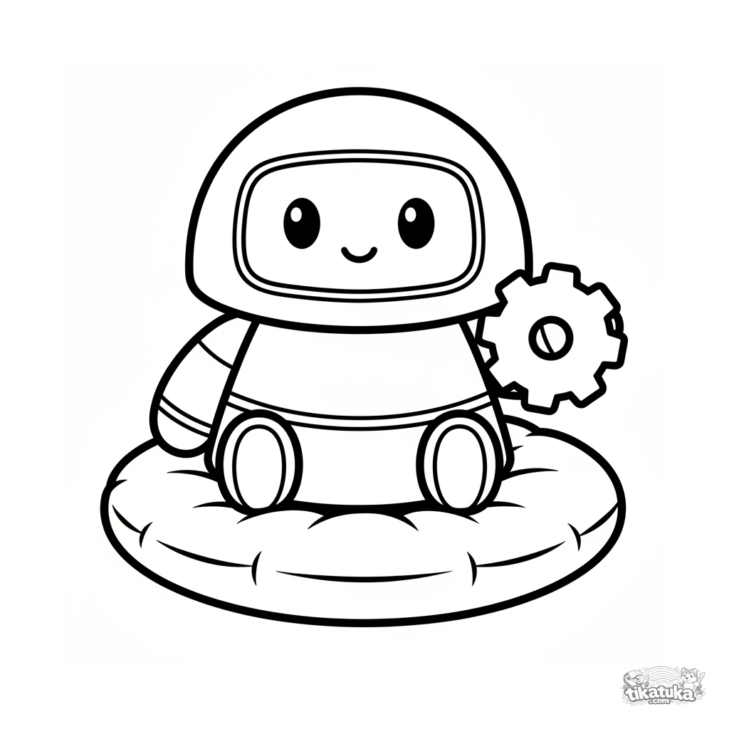 Ausmalbild für Kleinkinder: ein runder, freundlicher Roboter sitzt auf einem Kissen und hält ein großes Zahnrad. Große, klare Formen perfekt für 2-3 Jahre.