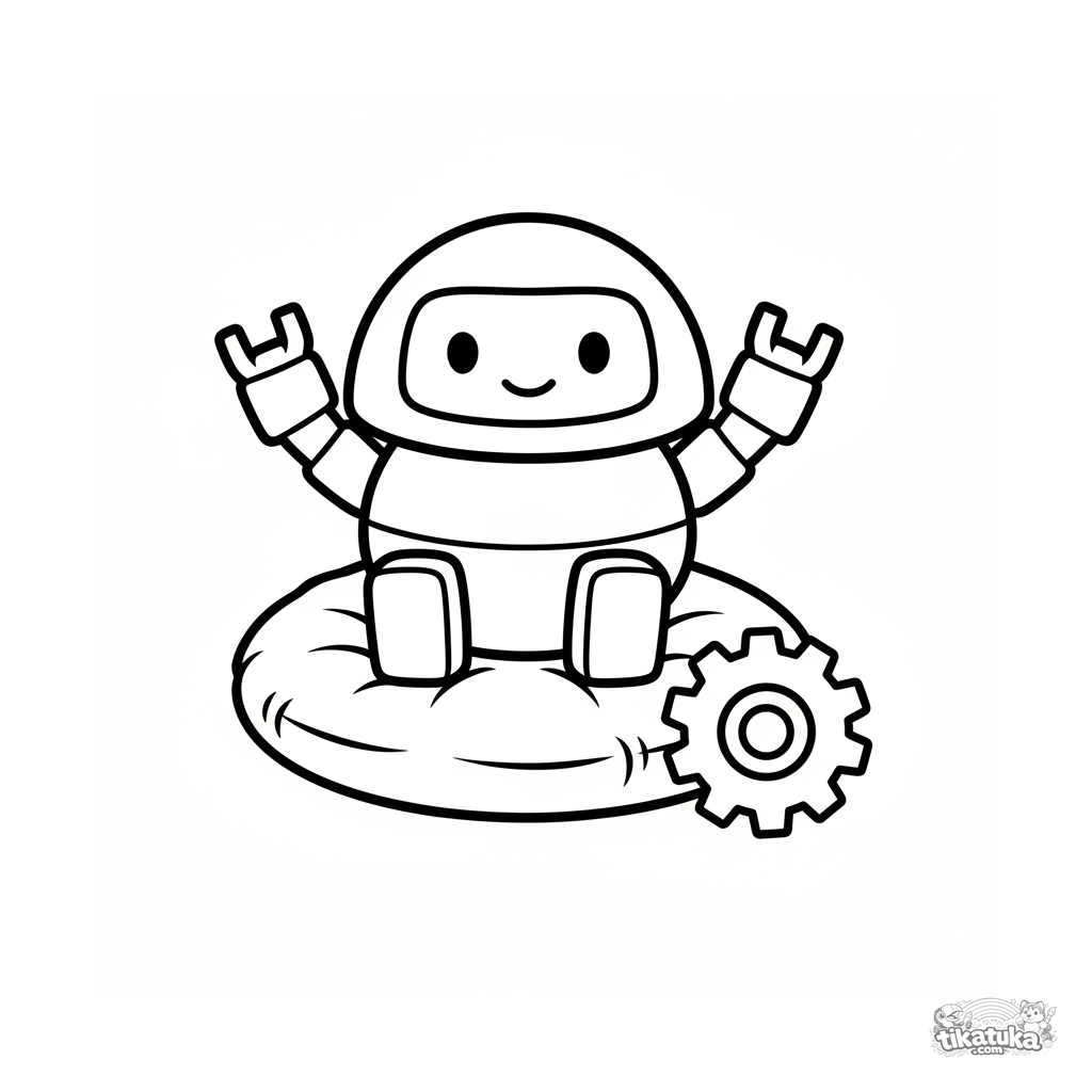 Einfaches Ausmalbild für 2-3 Jahre: ein runder, freundlicher Roboter sitzt auf einem Kissen. Große, klare Umrisse.