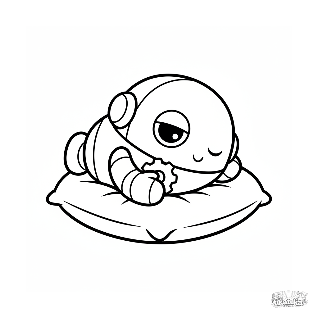 Einfaches Kleinkind-Malbild: ein runder, freundlicher Roboter ruht auf einem Kissen. Große geometrische Formen, wenige Linien, leicht auszumalen.