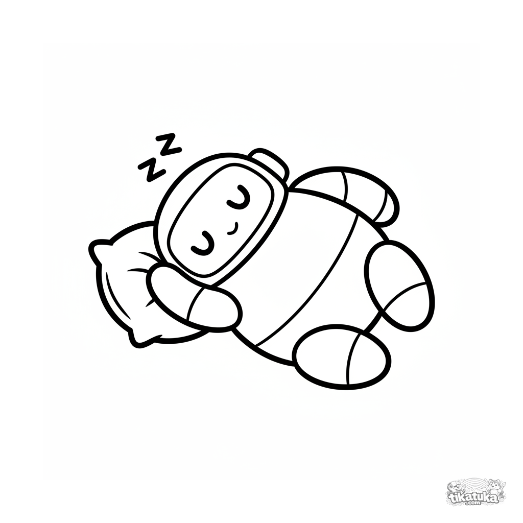 Einfaches Ausmalbild für Kinder von 2-3 Jahren: ein freundlicher runder Roboter schläft auf einem großen weichen Kissen. Große klare Formen, leicht auszumalen.