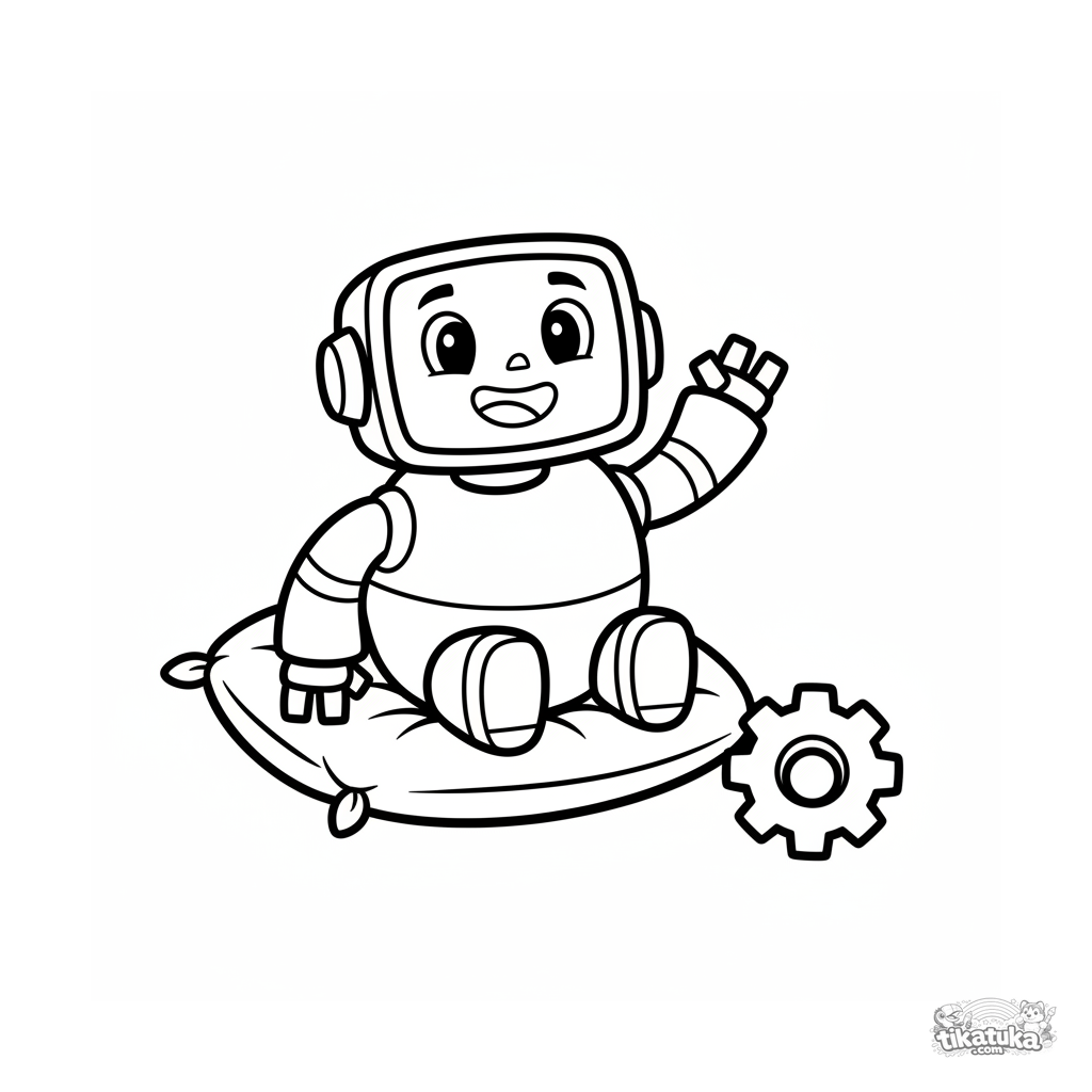 Einfaches Ausmalbild für Kleinkinder: ein freundlicher, runder Roboter winkt auf einem weichen Kissen. Große, klare Umrisse.
