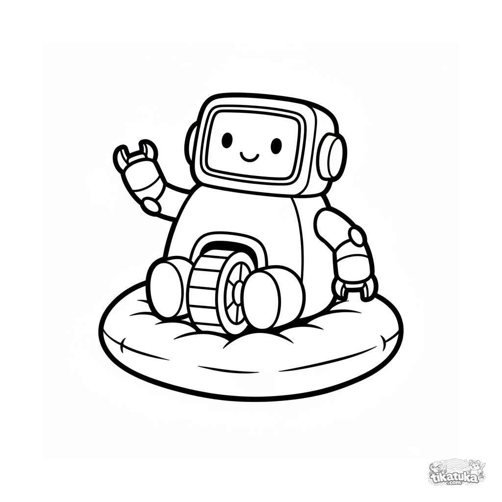Einfaches Ausmalbild für 2-3 Jahre: ein runder freundlicher Spielzeugroboter sitzt auf einem Kissen und winkt. Große klare Umrisse.