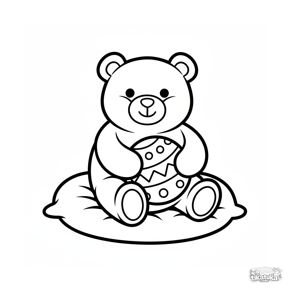 Einfaches Ausmalbild für 2-3 Jahre: ein Plüschteddy umarmt einen Ball auf einem weichen Kissen. Große klare Umrisse.
