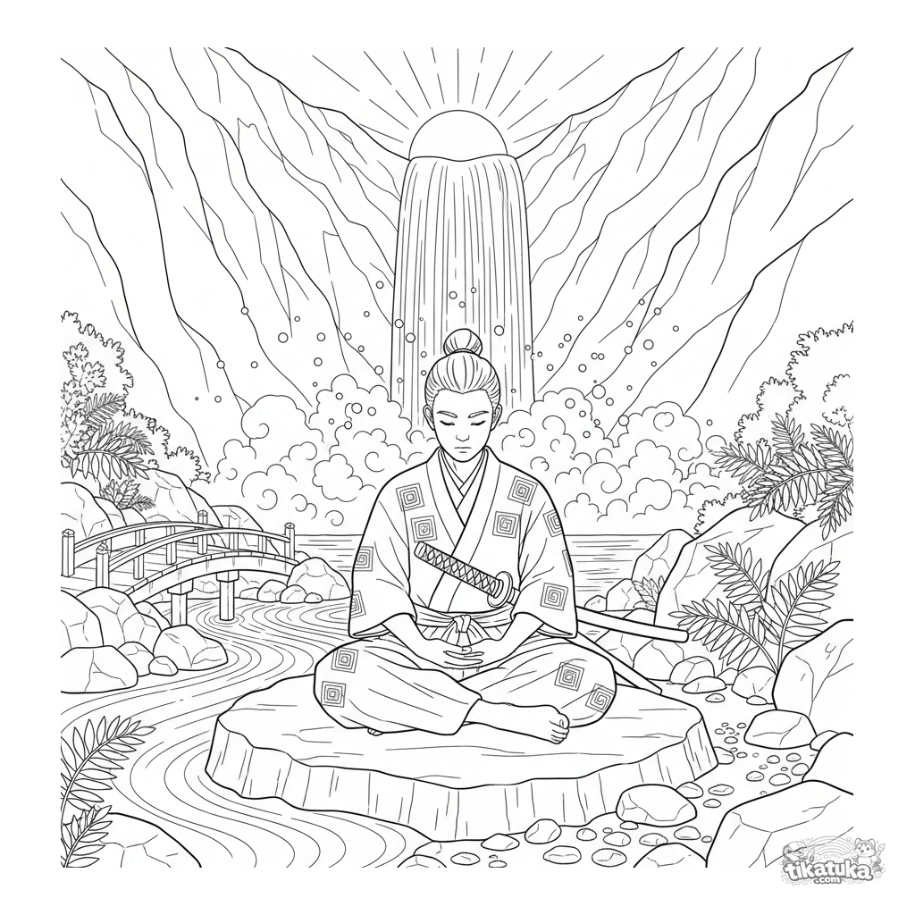 Detailliertes Anime-Ausmalbild: Ein Samurai-Lehrling meditiert an einem Bergwasserfall im Morgengrauen. Ruhige, aber komplexe Szene mit Naturdetails für 10-12-Jährige.