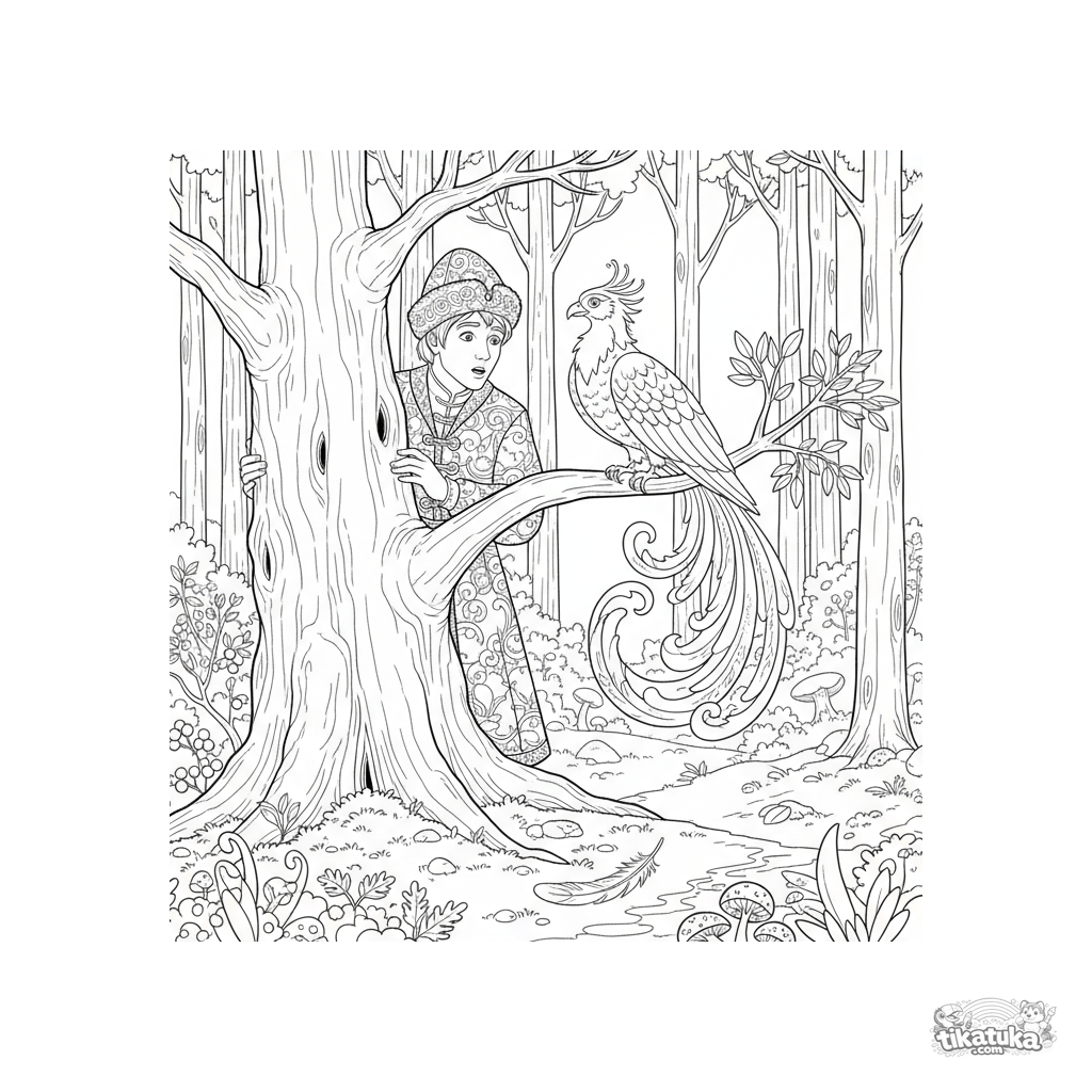 Ausmalbild aus dem Märchen 'Der Feuervogel'. Prinz Iwan beobachtet den magischen Vogel im Wald. Für ältere Kinder von 7-12 Jahren. Detaillierte Szene mit einer Eiche und leuchtender Feder.