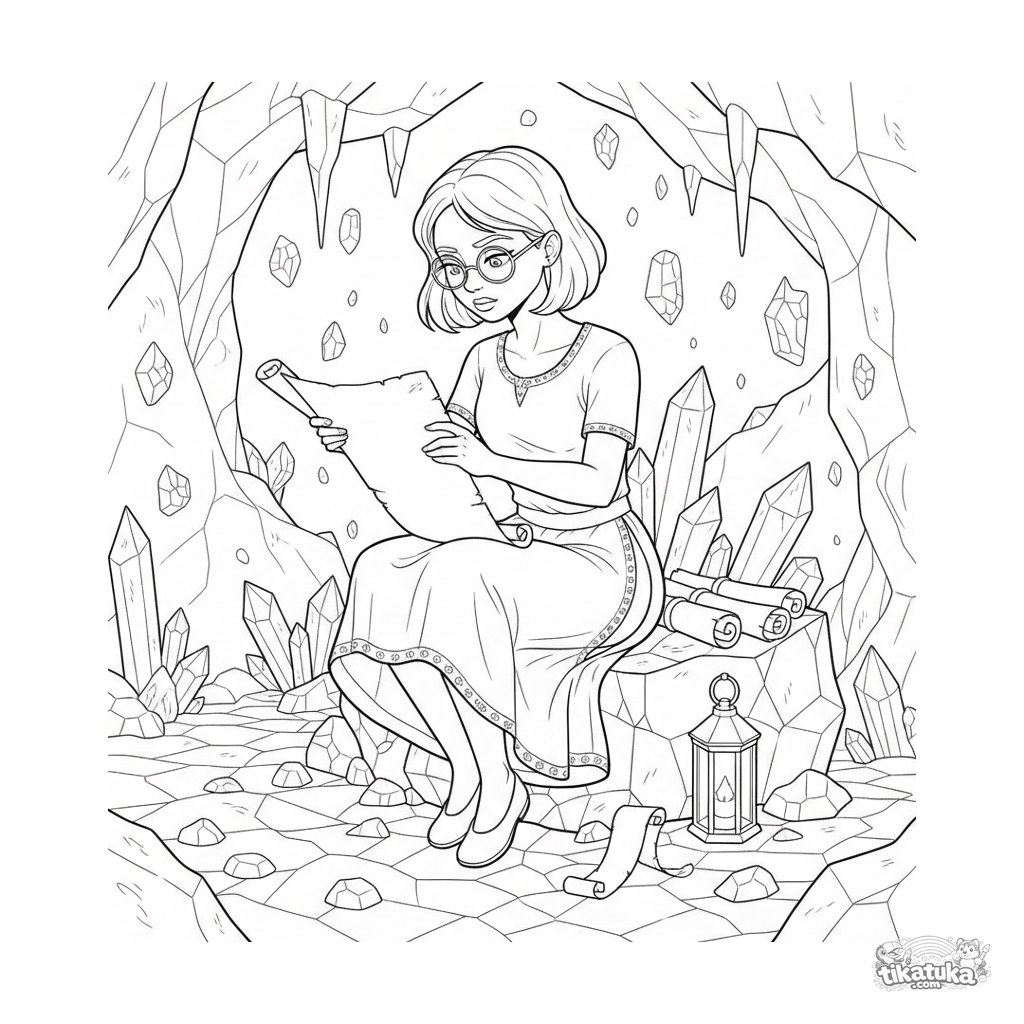 Detailliertes Ausmalbild für ältere Kinder 10-12: Eine gelehrte Prinzessin liest eine alte Schriftrolle in einer leuchtenden Kristallhöhle. Komplexe Details.