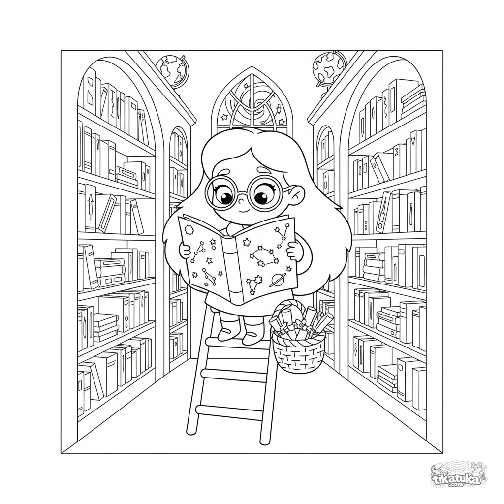 Ausmalbild für Kinder 4-6: Eine gelehrte Prinzessin mit Brille liest einen Riesenatlas in einer alten Bibliothek. Eine lustige Szene auf einer Leiter.