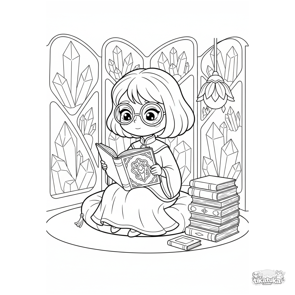 Ausmalbild für Kinder 7-9: Eine gelehrte Prinzessin mit Brille liest ein uraltes Buch in einer magischen Kristallbibliothek. Nachdenkliche Atmosphäre.