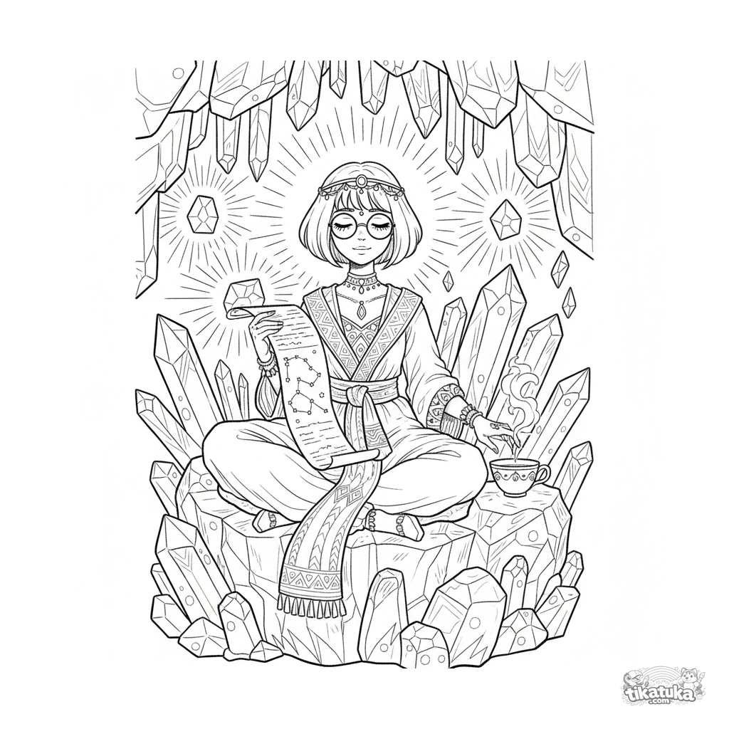 Detailliertes Ausmalbild für ältere Kinder 10-12: Eine Gelehrtenprinzessin studiert Sternkarten in einer leuchtenden Kristallhöhle.