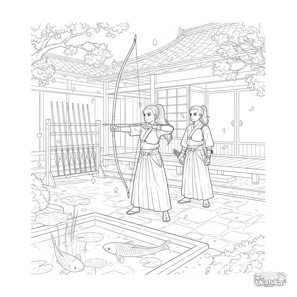 Detailliertes Anime-Ausmalbild: Schul-Kyudo-Club-Mitglieder üben im Steinhof eines traditionellen Dojos. Szene mit Koi-Teich, Bogenständern und treibenden Kirschblüten für 10-12 Jahre.