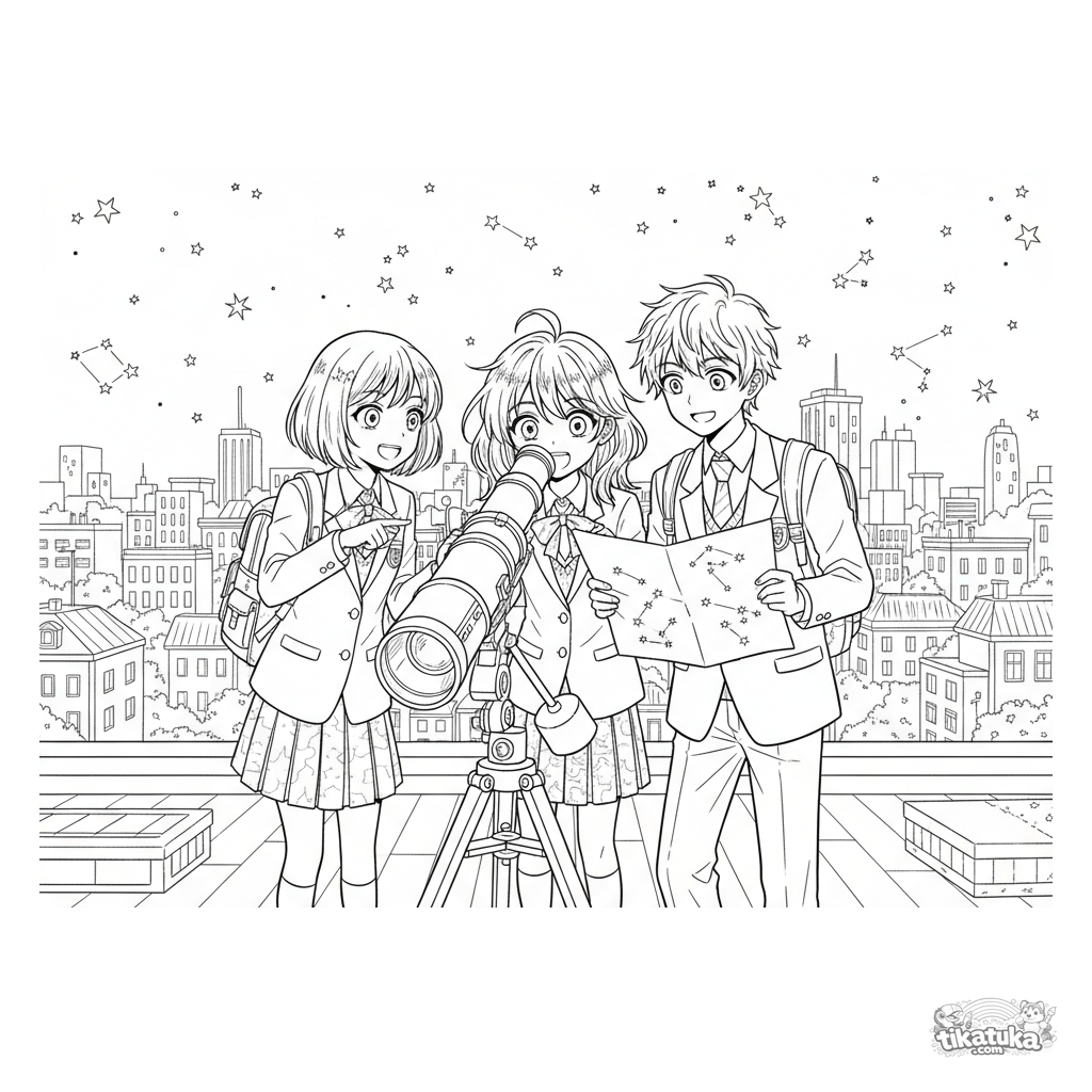 Detailliertes Anime-Ausmalbild für 10-12 Jahre. Mitglieder eines Schulastronomieclubs beobachten Sterne vom Schulsdach aus, mit einem Teleskop und einer Sternkarte.