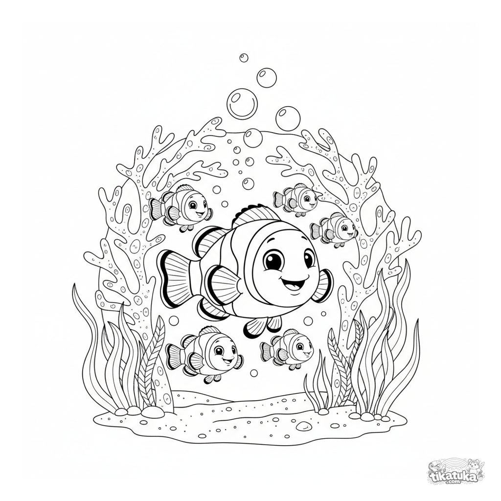 Komplexes Ausmalbild für Kinder von 7-12 Jahren einer Unterwasserszene. Eine Schule fröhlicher Clownfische schwimmt durch einen Korallentunnel mit Blasen und Seegras. Viele Details, Cartoon-Stil.