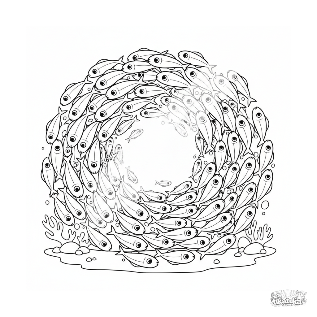 Papierschnitt-Stil Ausmalbild: Ein Schwarm silberner Fische wirbelt in einem Sonnenstrahl im Flachwasser. Für Kinder von 7-9 Jahren.