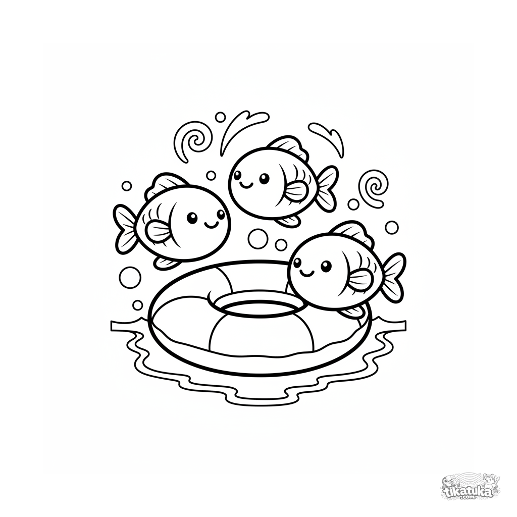 Ausmalbild für Kinder von 7-9 Jahren: Eine fröhliche Schule von Fischen schwimmt im Kreis um einen Schwimmring am Poolboden. Saubere Umrisse, flacher Stickerbogen-Stil, symmetrische Komposition.