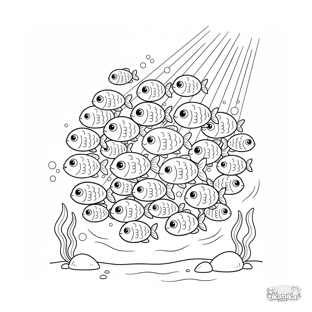 Ausmalbild eines dynamischen Schwarms winziger silbriger Fische, die in einem Sonnenstrahl im Flachwasser spielen. Für 7-9 Jahre.