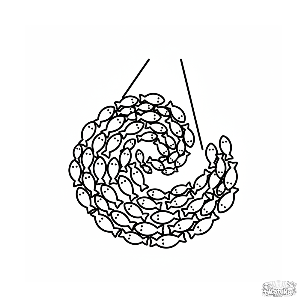 Sehr einfaches Ausmalbild eines Schwarms kleiner Fische, der in einem Sonnenstrahl im Flachwasser wirbelt. Für Kleinkinder von 2-3 Jahren.