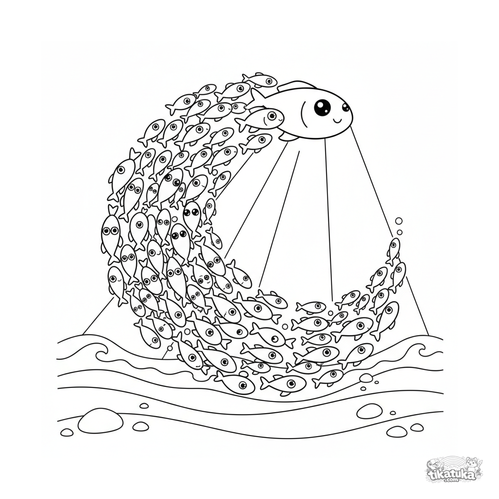 Ausmalbild für Kinder von 4-6 Jahren: ein Schwarm silberner Fische schießt durch einen Sonnenstrahl im Flachwasser. Dynamische Szene mit Aquarell-Skizzen-Atmosphäre.