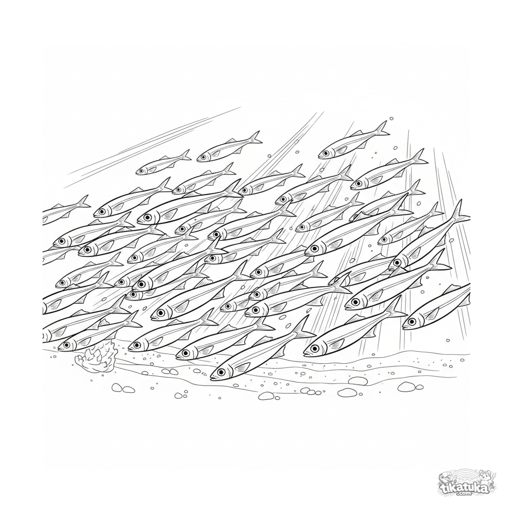 Ausmalbild eines großen Schwarms winziger Ährenfische, die durch einen Sonnenstrahl im flachen Wasser schwimmen. Für Kinder von 4 bis 6 Jahren.