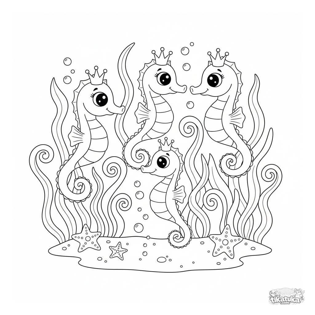 Kinder Ausmalbild: verspielte Seepferdchen tanzen zwischen lockigem Seetang in einer Unterwasserszene. Dynamische Komposition mit Blasen für Kinder von 4-6.