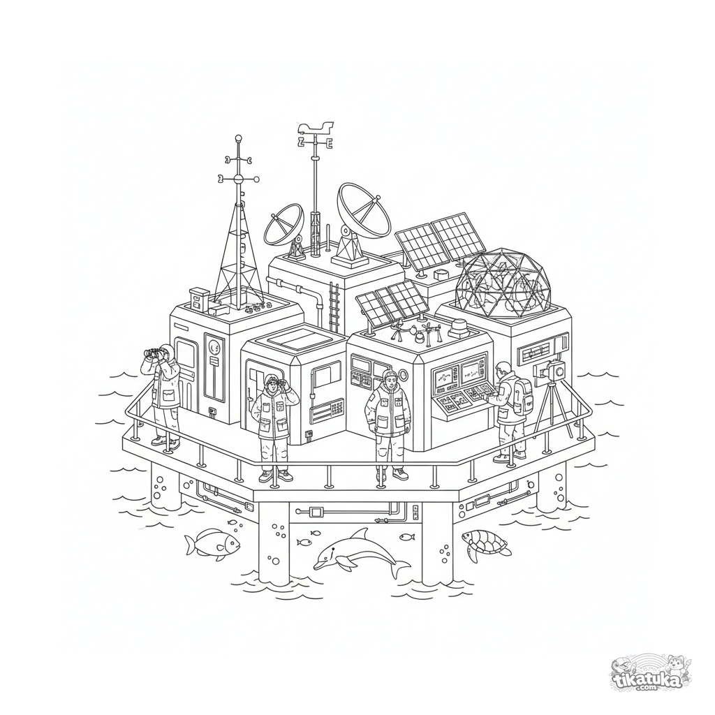 Ausmalbild: Eine detaillierte wissenschaftliche Forschungsstation auf einer schwimmenden Meeresplattform für Kinder von 10-12 Jahren. Mit Instrumenten, Antennen, Solarpanelen und arbeitenden Wissenschaftlern.