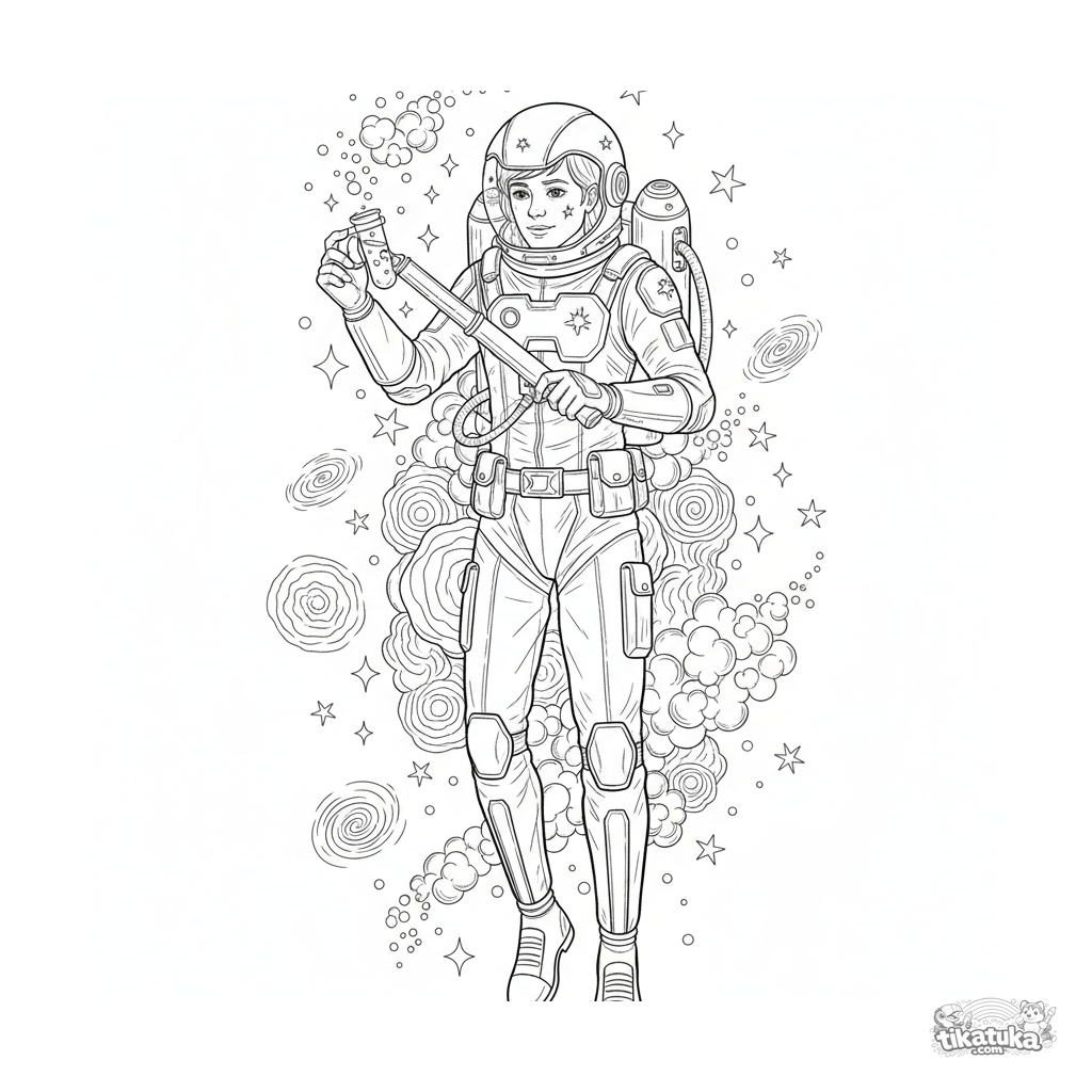 Ausmalbild für 10-12 Jahre: Ein Wissenschaftler mit Jetpack arbeitet im Weltraum und sammelt Sternenstaubproben zwischen den Sternen. Technischer Stil.