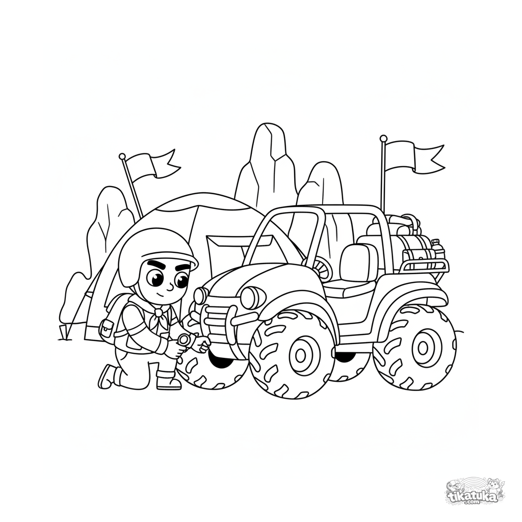 Ausmalbild eines Aufklärungs-Quads am Kommandozelt. Für Kinder von 7-9 Jahren. Enthält ein Quad mit großen Reifen, einen Scout, der den Druck prüft, einen Rucksack und eine Feldflasche.