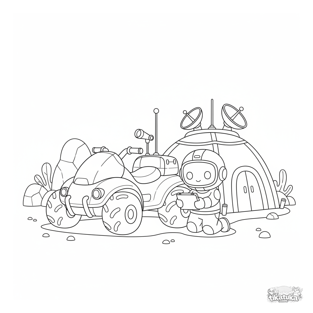 Ausmalbild für Kinder 4-6: Ein futuristisches Aufklärungs-ATV ist am Kommunikationszelt des Feldhauptquartiers geparkt. Der Aufklärer überprüft ein Kartengerät.