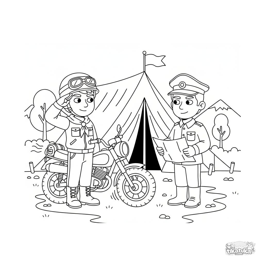 Ausmalbild für 7-9 Jahre: Ein Aufklärer auf einem Motorrad meldet sich bei einem Offizier am Kommandopostenzelt.