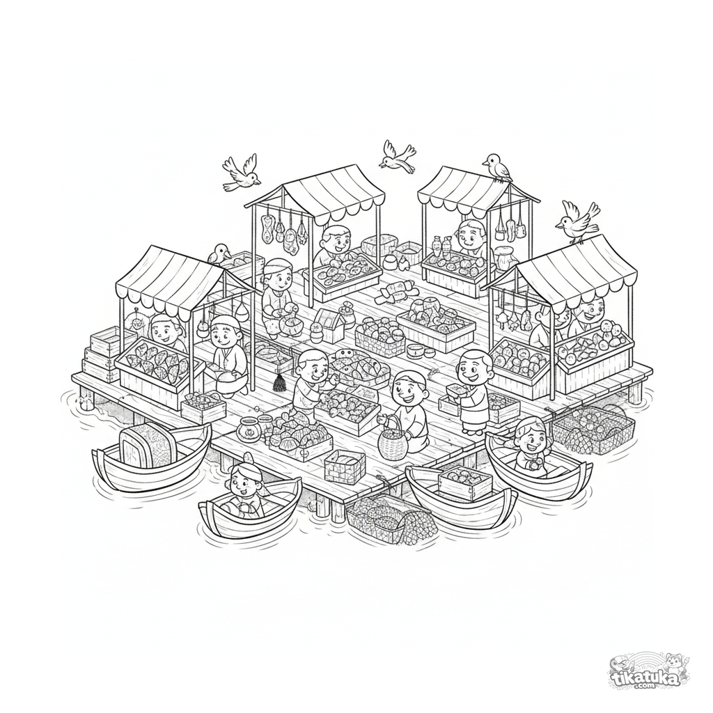 Ausmalbild für 10-12 Jahre: ein geschäftiger Seemarkt auf verbundenen schwimmenden Plattformen. Verkäufer verkaufen Fisch, Leute plaudern, umgeben von Booten und Kisten.
