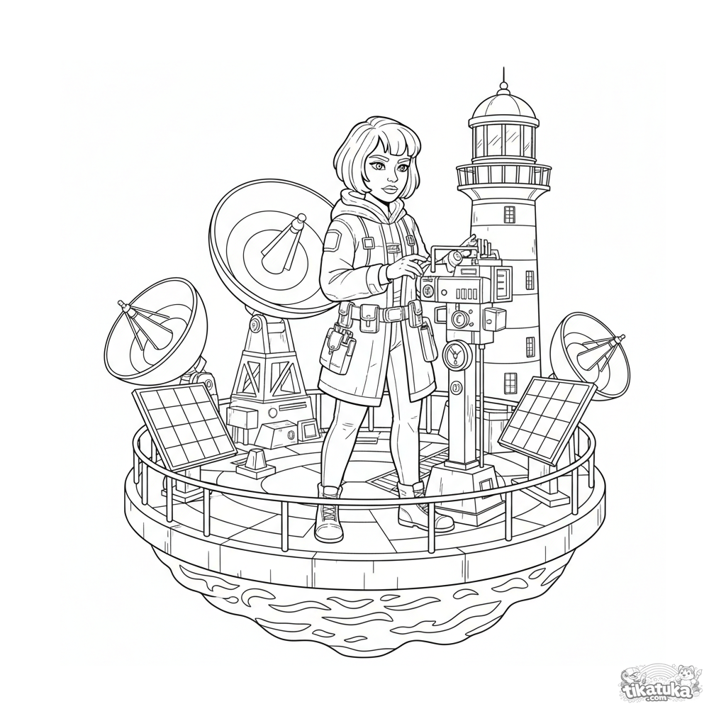 Detailliertes Ausmalbild für 10-12 Jahre: Ein Wissenschaftler arbeitet auf einer schwimmenden Meeresobservatoriumsplattform mit einem Leuchtturm, Satellitenschüsseln und wissenschaftlichen Instrumenten.
