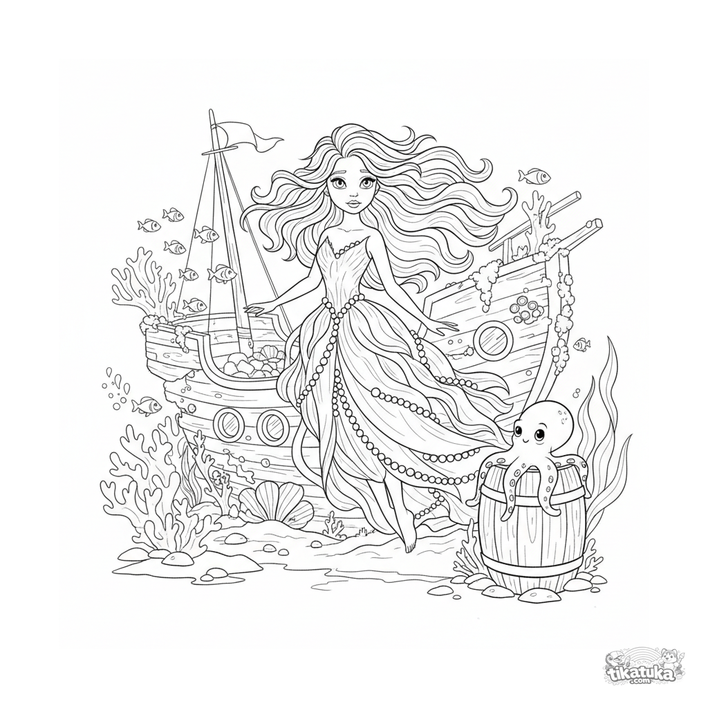 Ausmalbild für Kinder 4-6: Eine Meerprinzessin erkundet ein korallenbedecktes Schiffswrack mit Fischen und einem Oktopus.