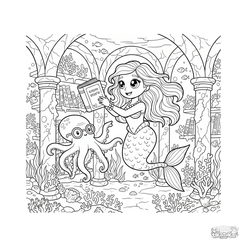 Ausmalbild für Kinder 7-9: Eine Meerjungfrau-Prinzessin erforscht eine versunkene Bibliothek mit einem Oktopus-Bibliothekar. Eine magische Unterwasserszene.