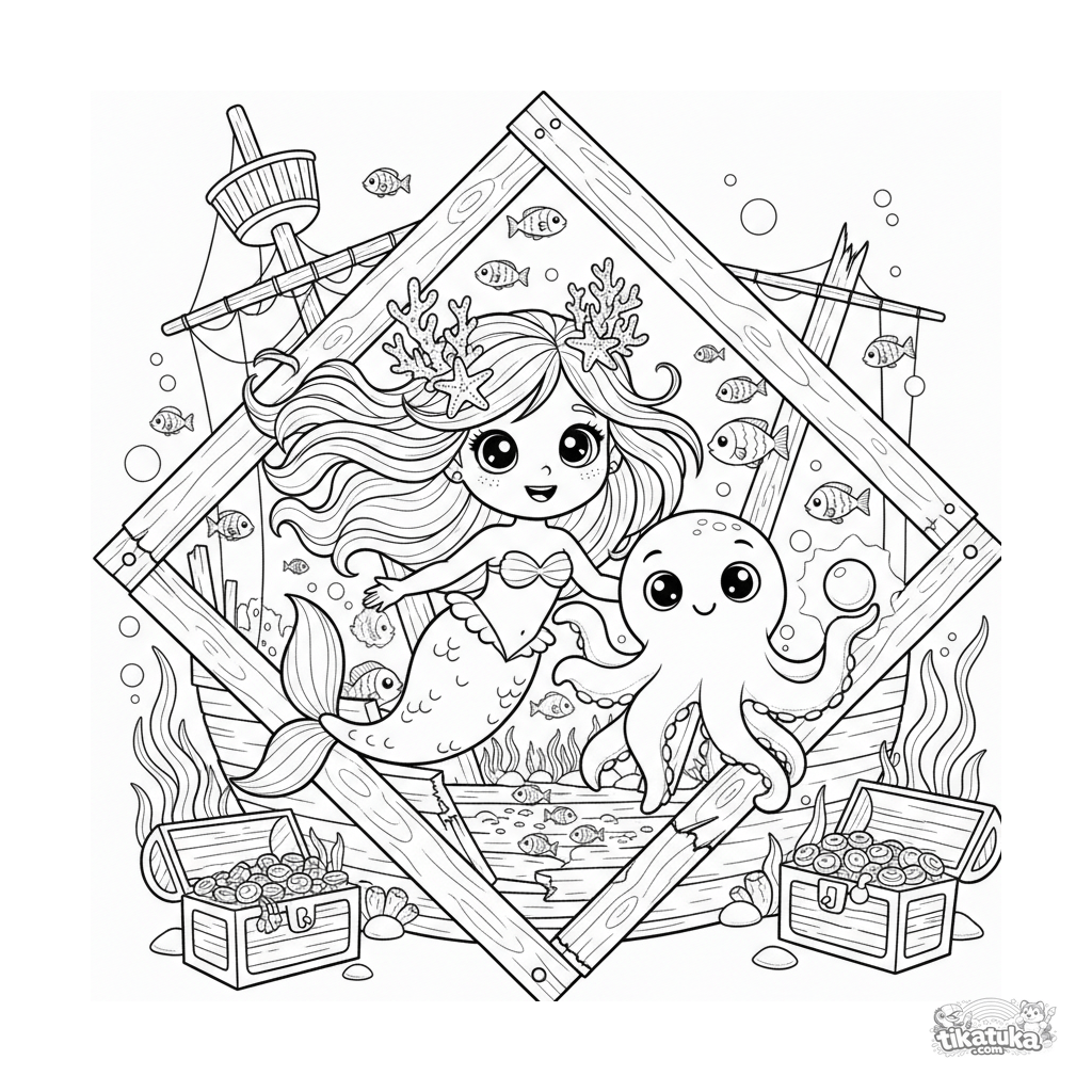 Ausmalbild für Kinder 4-6: Eine Meerprinzessin mit Schwanz erforscht ein gesunkenes Schiff mit einem freundlichen Oktopus.