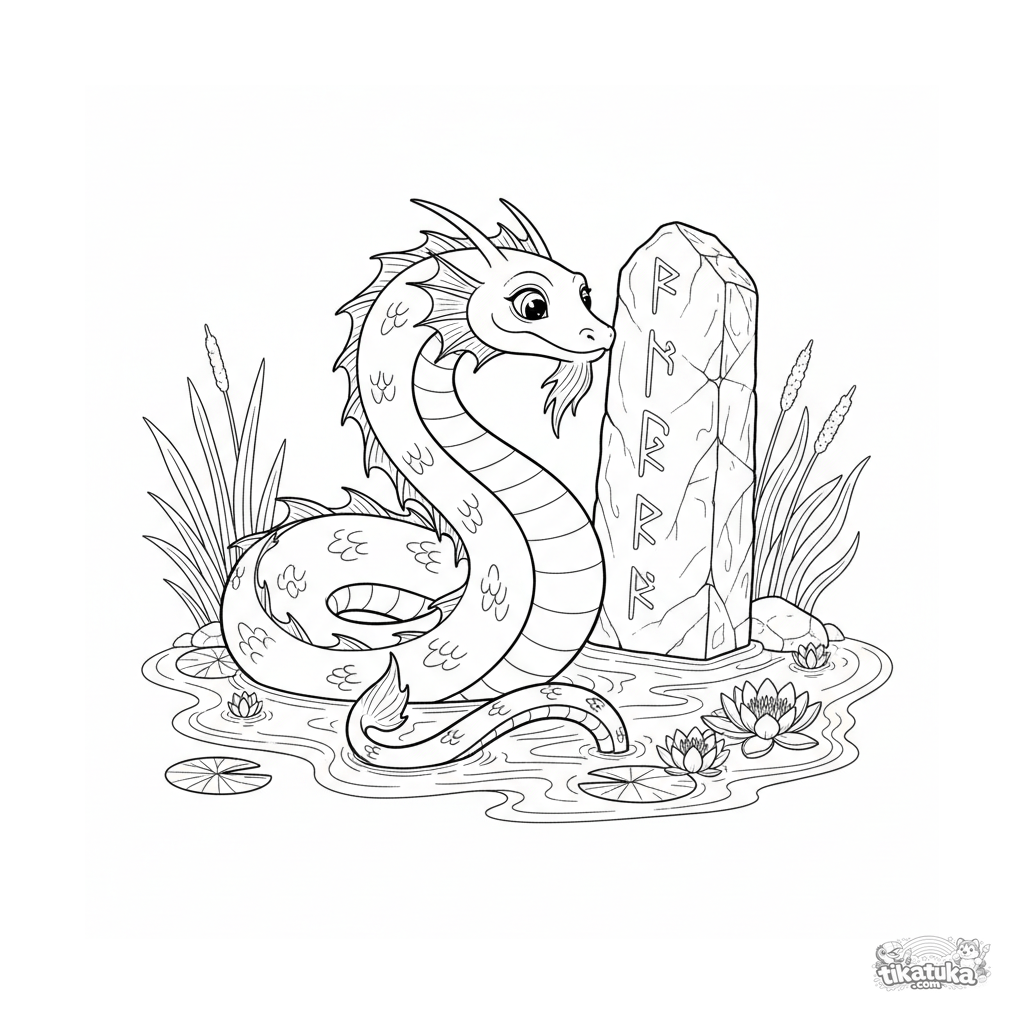 Anspruchsvolles Ausmalbild für ältere Kinder 10-12: eine freundliche Seeschlange windet sich um einen halb versunkenen Runenstein in einem Waldteich. Detaillierte Schuppen, Wasserpflanzen und alte Symbole.