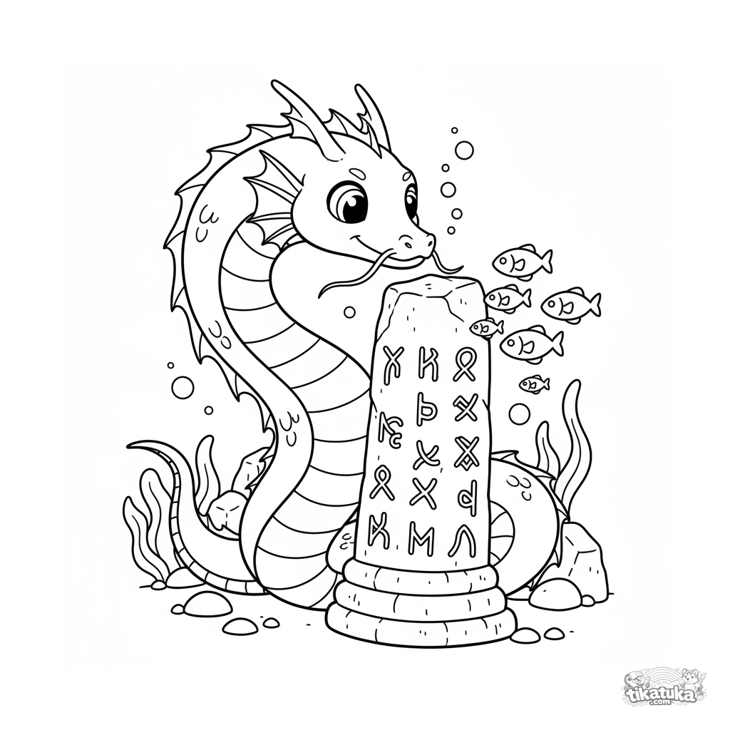 Ausmalbild für Kinder 4-6: Eine freundliche Seeschlange spielt um einen versunkenen Runenpfeiler. Klare Formen, mäßiger Hintergrund.