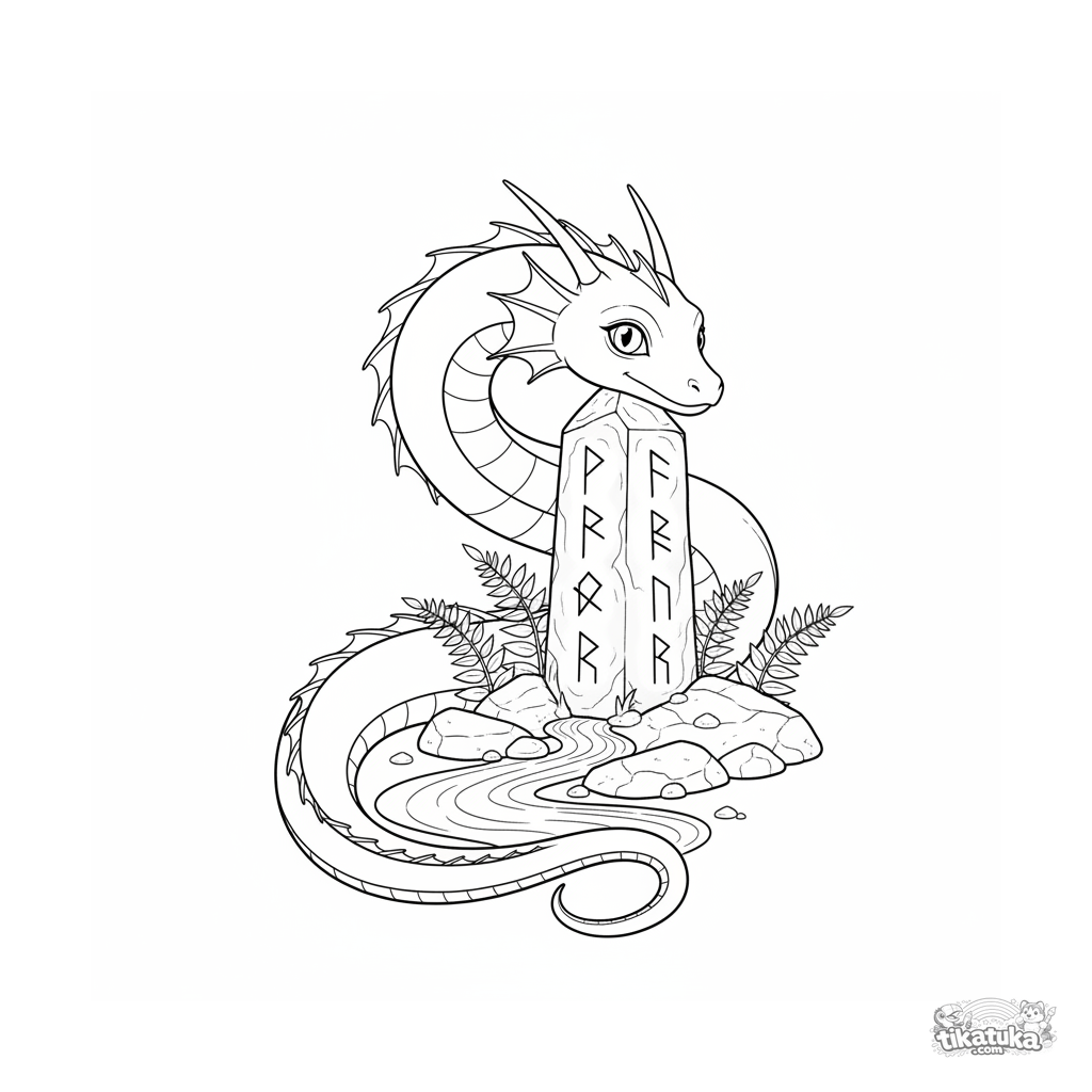 Ausmalbild für 10-12 Jahre: Eine detaillierte Seeschlange windet sich um einen alten Runenmonolithen an einem Bach. Eine naturalistische Szene für erfahrene Ausmaler.