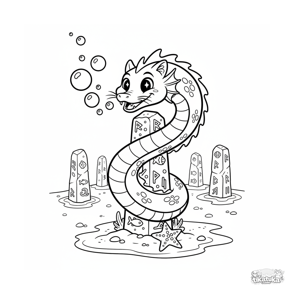 Ausmalbild für Kinder von 4-6 Jahren: eine freundliche Seeschlange windet sich spielerisch um einen Runenmonolithen in einer Lagune.