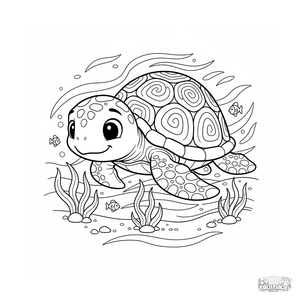 Ausmalbild einer Meeresschildkröte, die im sonnigen Flachwasser Seegras frisst. Klassische Disney-Illustration für Kinder im Alter von 4-6 Jahren.
