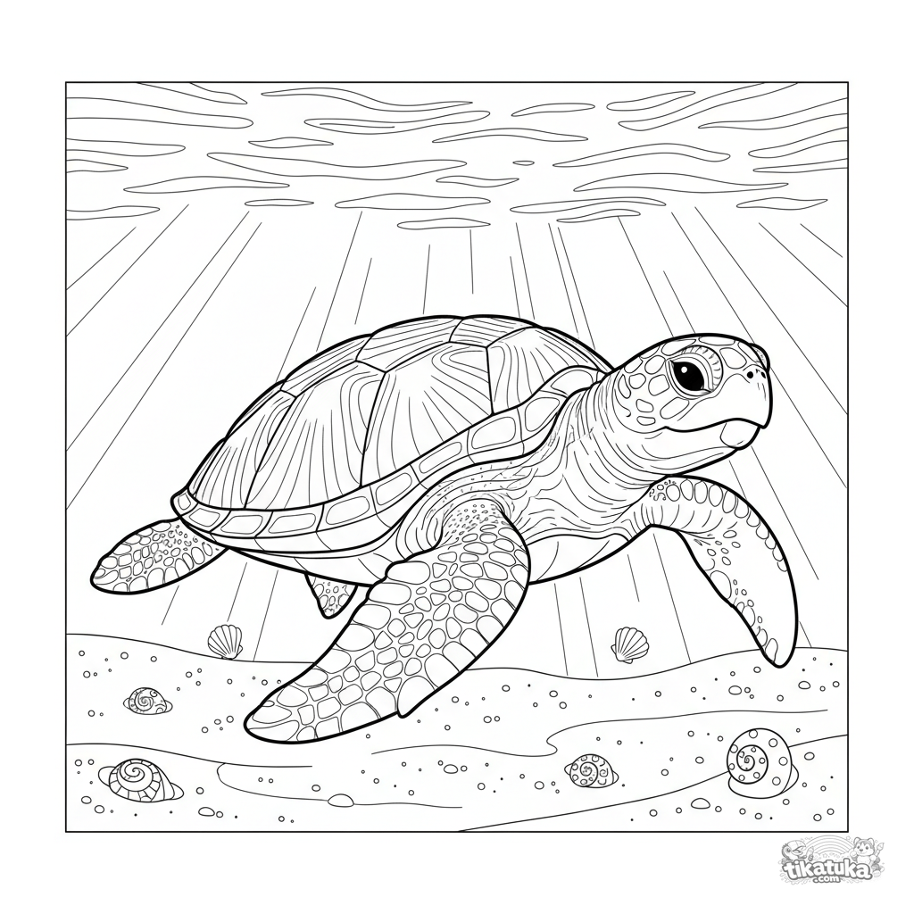 Ausmalbild einer Meeresschildkröte, die durch sonnenbeschienenes Flachwasser gleitet. Für 10-12 Jahre. Detaillierte Illustration im Feldhandbuch-Stil.
