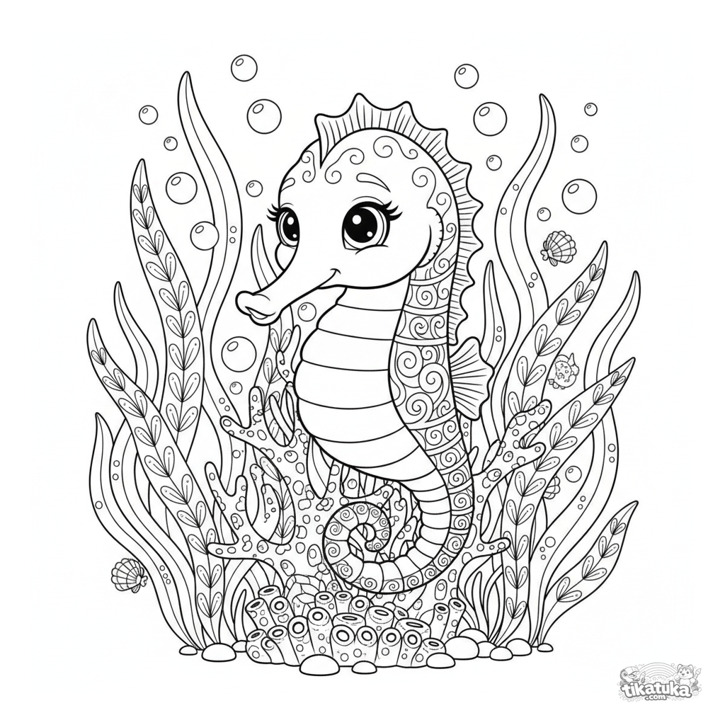 Detailliertes Seepferdchen-Ausmalbild für Kinder von 7-12 Jahren. Zeigt ein Seepferdchen, das sich um eine Koralle in einem Unterwasser-Tangwald schlingt, mit schwebenden Blasen.