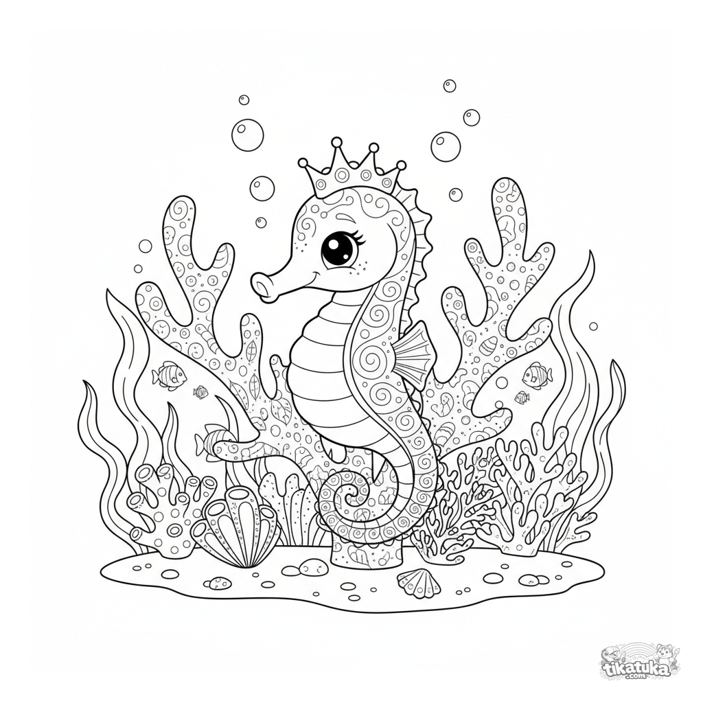 Detailliertes Ausmalbild für Kinder von 7-12 Jahren mit einem Seepferdchen. Die anmutige Kreatur ist um einen verzweigten Korallen auf einem bunten Unterwasser-Riff geschlungen.