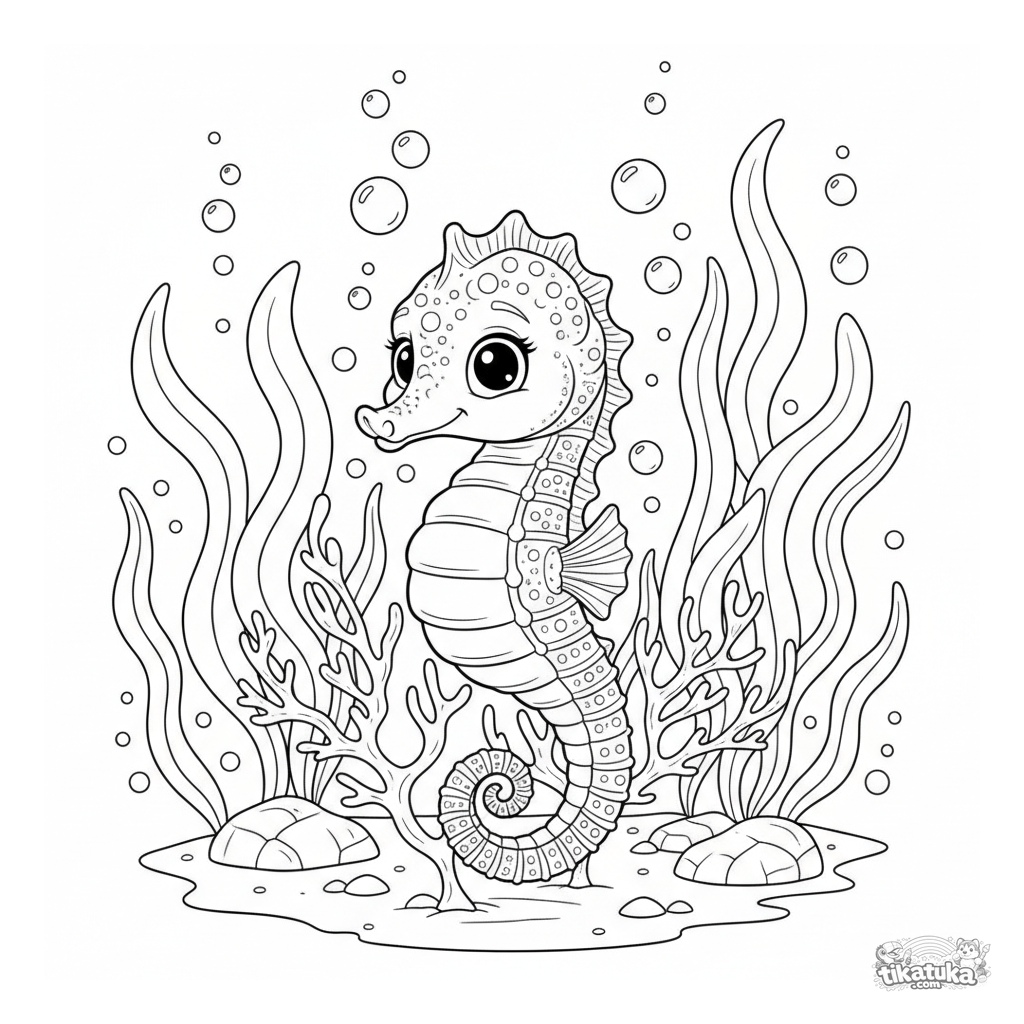 Detailliertes Ausmalbild eines Seepferdchens in einem Unterwasser-Tangwald für Kinder von 7-12 Jahren. Szene mit Korallen, Blasen und fließenden Linien.