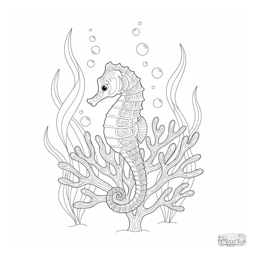 Detailliertes Ausmalbild für ältere Kinder von 7-12 Jahren mit einem Seepferdchen. Unterwasserszene mit dem Seepferdchen, das sich um eine Koralle im Tangwald schlingt.