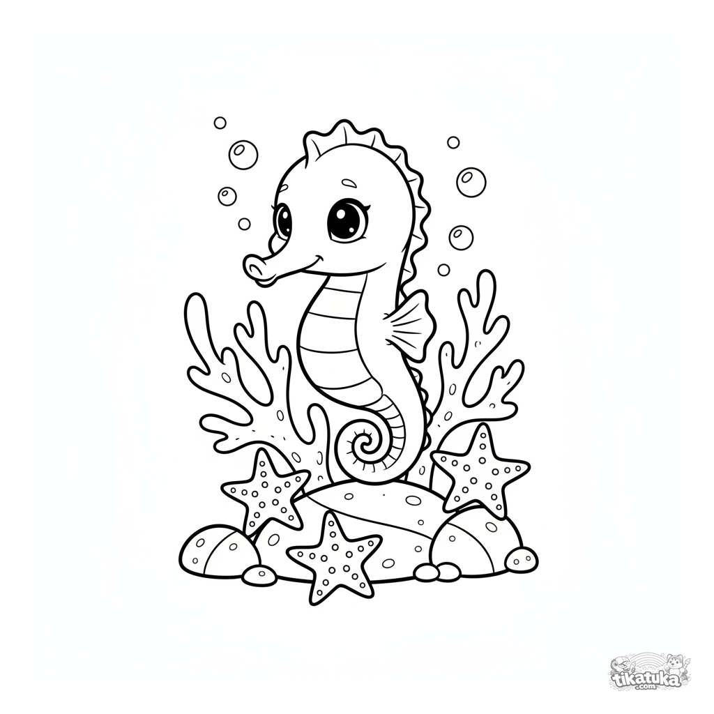 Ausmalbild eines Seepferdchens auf einem Korallenriff für Kinder von 4-6 Jahren. Das Seepferdchen schlingt sich um einen Korallenast mit Blasen und Seesternen.