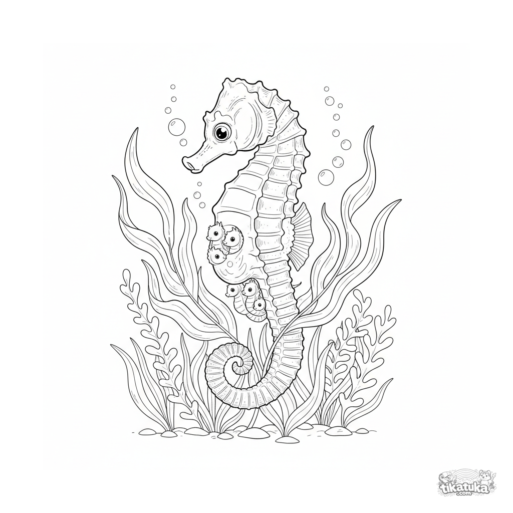 Detailliertes Ausmalbild eines Seepferdchen-Vaters, der Babys in einem sonnigen Seetanggarten trägt. Für 10-12 Jahre.