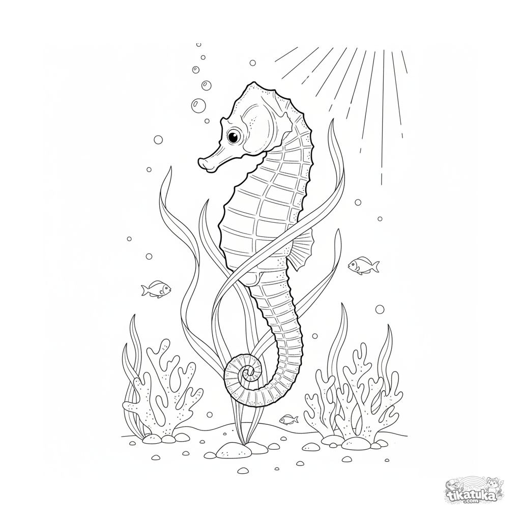 Detailliertes Ausmalbild im Vintage-Gravur-Stil: Ein Seepferdchen-Vater im Seetang im sonnigen Flachwasser. Für 10-12 Jahre.