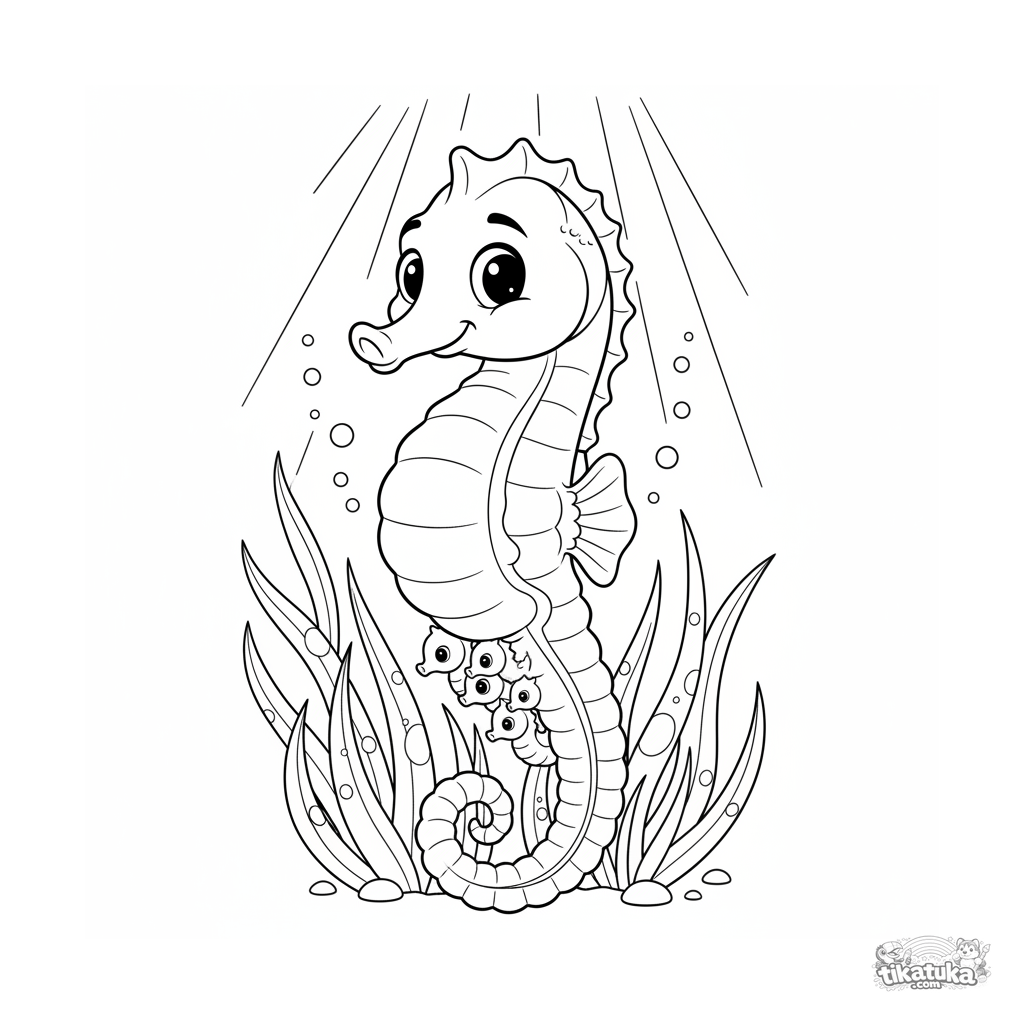 Ausmalbild für Kinder 4-6: Ein Seepferdchen-Vater trägt seine Babys durch sonnenbeschienenes Seegras im flachen Wasser. Eine süße Szene zur Feinmotorik.