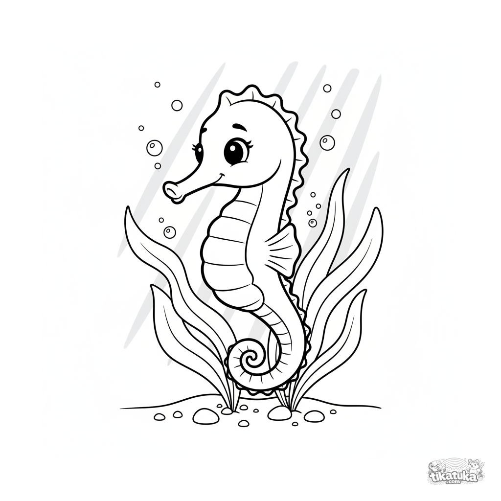 Ausmalbild eines Seepferdchens auf Seegras im sonnigen Flachwasser. Für Kinder von 4-6 Jahren.