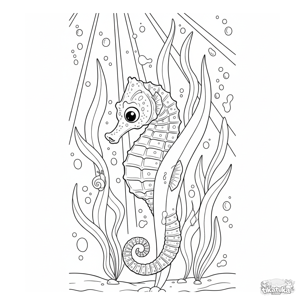 Detailliertes Ausmalbild eines Seepferdchens, das sich an Kelp in einem sonnenbeschienenen Unterwasserwald im Flachwasser klammert.